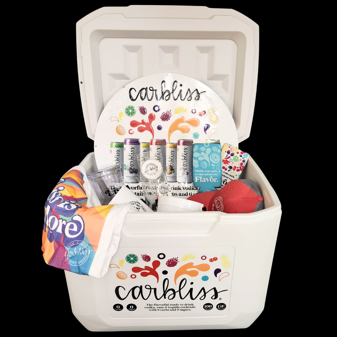 Enjoy the cool, clean flavors of Carbliss without the guilt! With 0 carbs, 0 sugars and only 100 calories, this bold and refreshing cocktail is the perfect drink to keep the good times flowing. Included in this basket is a 60 Qt. Coleman Cooler, 24″ Tin Tacker round Carbliss sign, 8 pack assorted Carbliss, Liss Is More 2XL t-shirt, trucker hat, cocktail can/bottle opener, 20oz. Tumbler with straw, 2-coozies, can cap, & a 16oz. glass. Liss is more!