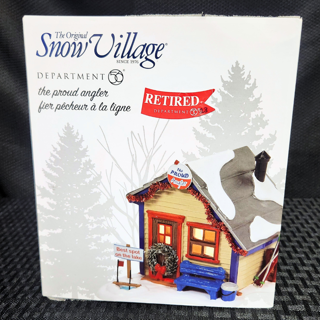 The Department 56 Original Snow Village has been built with the same traditions and values found in small towns across America for over 45 years. The brand’s first products were issued in 1976, and various distinct villages and sub-series have been introduced since then. The Proud Angler was introduced in January of 2022 and retired in November of 2023. This fishing shack on the lake is decorated with garland and stars, and the American flag has been painted on the side of the building. It’s the perfect addition to your Christmas Village!