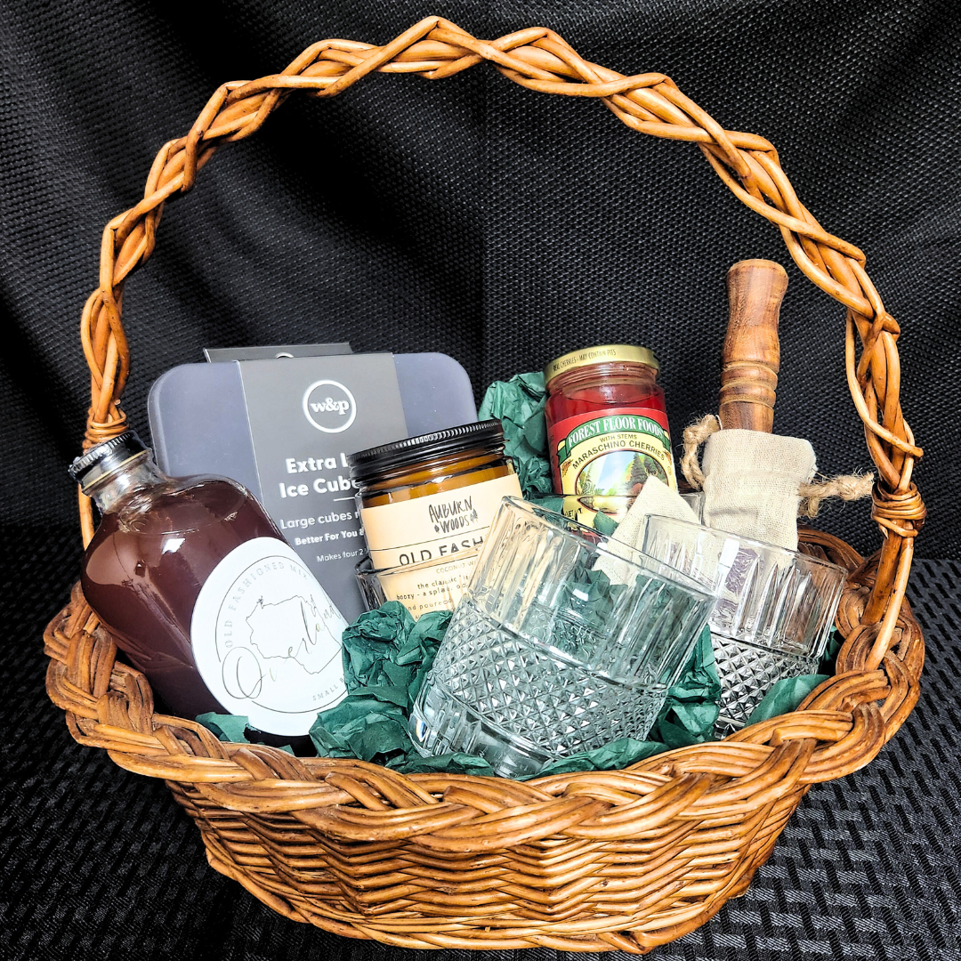 This basket includes a W&P extra large ice cube tray, Overland Old Fashioned mix, Auburn Woods Old Fashioned candle, Forest Floor Maraschino cherries, muddler w/ case, & 4- Old Fashioned glasses.