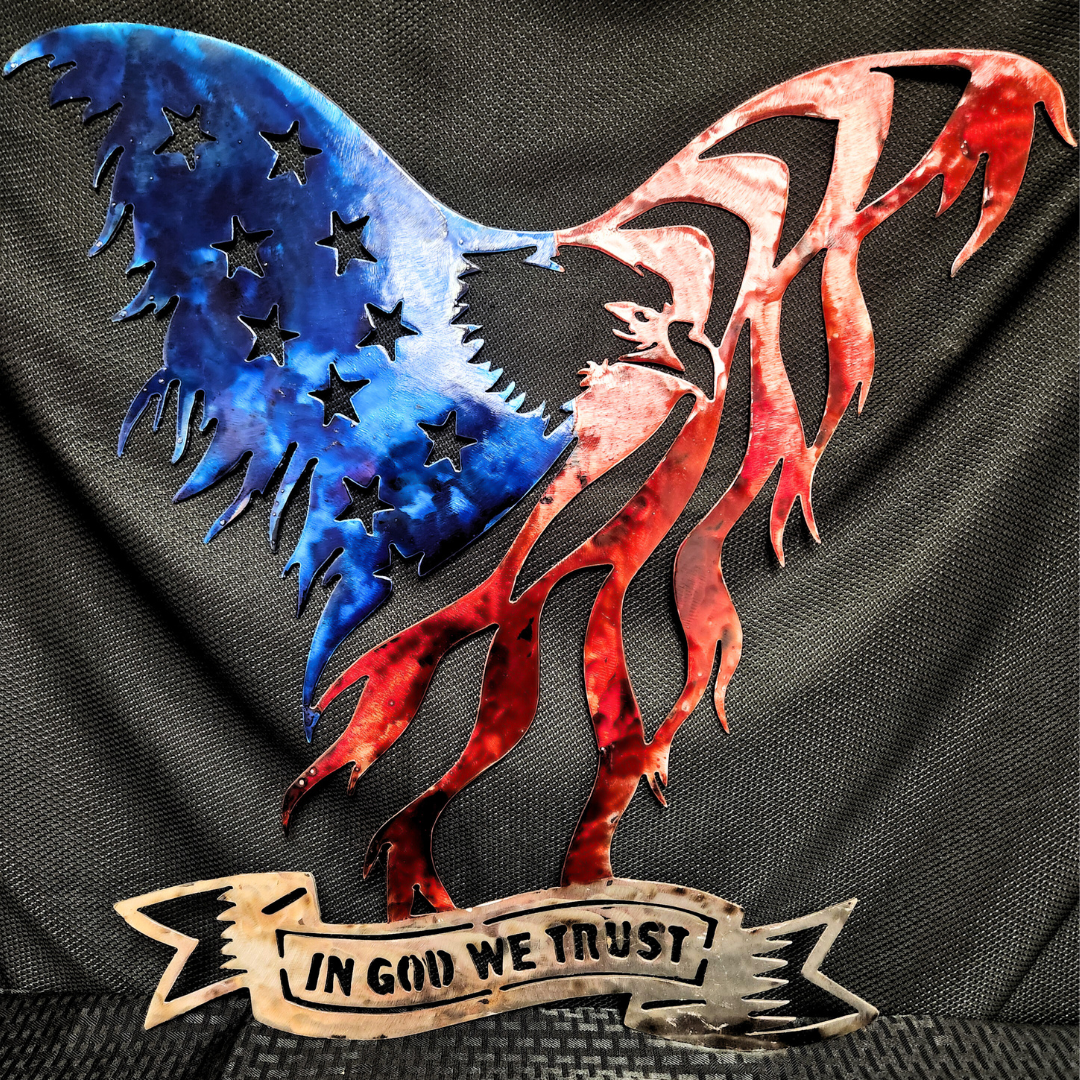 Show your American pride with this striking handcrafted metal art piece, featuring a majestic eagle in mid-flight. The left wing is cut with stars and bathed in deep blue, while the right wing blazes with bold red, capturing the spirit of freedom and strength. Below, a banner proclaims the powerful words: “In God We Trust.”